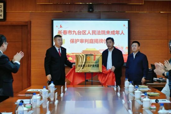 在熱烈的掌聲中,長春市九臺區(qū)委常委、政法委書記孫文斌、長春市九臺區(qū)副區(qū)長、市公安局九臺分局局長秦力民與邵杰共同為“長春市九臺區(qū)人民法院未成年人保護(hù)審判庭”揭牌。