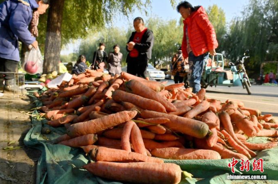 10月16日,吉林長春,市民在挑選胡蘿卜。當(dāng)下正是中國東北民眾“囤秋菜”的季節(jié),滿載大蔥、白菜、胡蘿卜等秋菜的貨車停靠在長春市區(qū)指定銷售區(qū)域,市民們穿梭挑選,忙碌地儲備過冬秋菜。中新社記者 張瑤 攝